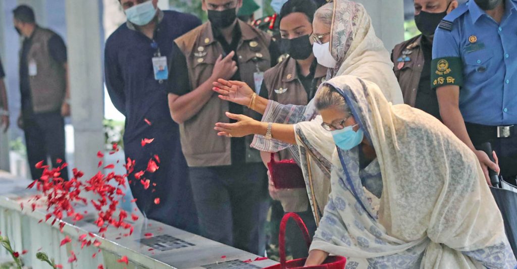 সেখানে তারা পরিবারের সদস্যদের কবর জিয়ারত করেন। শেখ হাসিনা ও শেখ রেহানা স্বজনদের কবরে ফুলের পাপড়ি ছিটিয়ে শ্রদ্ধা নিবেদন করেন।