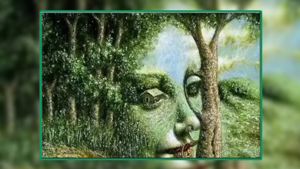 আজকের ছবিটিতে রয়েছে একটি জঙ্গলের দৃশ্য। কিন্তু ছবিটির মধ্যেই লুকিয়ে আছে টুকরো টুকরো ছবি—জঙ্গলের গাছপালার মধ্যে একটি মুখের আদল। আবার এক জায়গায় যেন তৈরি হয়েছে একটি মহিলার অবয়ব, যিনি আপেল পাড়ছে।