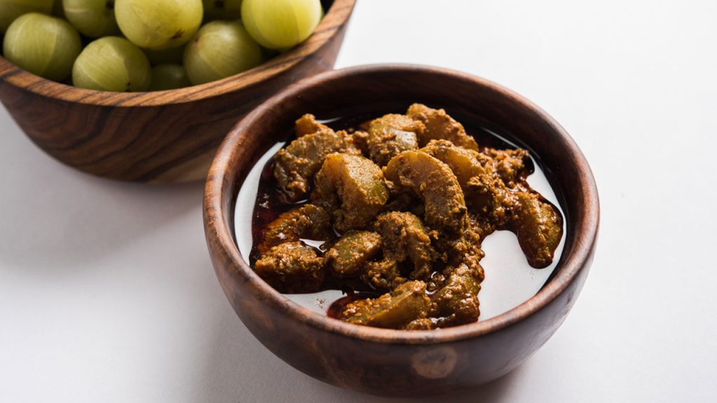 আমলকি কেটে ছোট ছোট টুকরা করে নিতে হবে। তেঁতুল গরম পানিতে ভিজিয়ে রেখে বিচি ফেলে পেস্ট তৈরি করে নিতে হবে। এর সঙ্গে হলুদ গুঁড়া, মরিচ গুঁড়া, মেথি গুঁড়া ও লবণ মিশিয়ে নিতে হবে। কড়াইয়ে অর্ধেক তেল দিয়ে আমলকি দিয়ে ভেজে নিতে হবে। কিছুক্ষণ ঢেকে রাখতে হবে যতক্ষণ না নরম হয়। এরপর তেঁতুলের পেস্ট এবং বাকি তেল দিয়ে পাঁচ থেকে ১০ মিনিট নাড়াচাড়া করতে হবে। তারপর গুড় দিয়ে কিছুক্ষণ রাখতে হবে। এবার অন্য একটি প্যানে ১ টেবিল চামচ তেল দিয়ে তাতে সরিষা ও মেথি দিতে হবে। যখন ফুটতে থাকবে তখন আমলকির মিশ্রণে ছেড়ে দিতে হবে। এরপর নামিয়ে ঠান্ডা করে পরিবেশন করতে হবে।