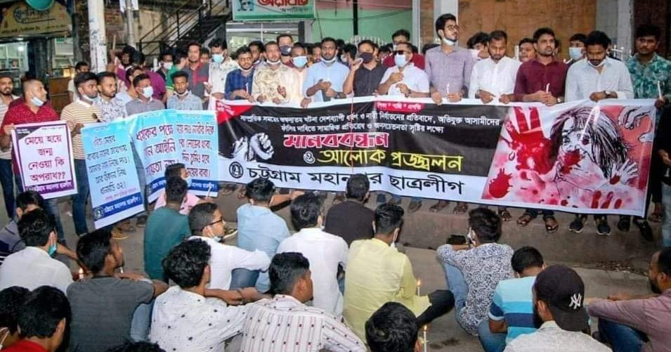 সাম্প্রতিক সময়ের জঘন্যতম ঘটনা দেশব্যাপী ধর্ষন, নারী নির্যাতন ও এসকল ঘটনার সাথে জড়িত সকল দোষীদের সর্বোচ্চ শাস্তি নিশ্চিতের দাবিতে কেন্দ্রীয় ছাত্রলীগের সভাপতি – সাধারন সম্পাদক এর নির্দেশনা অনুযায়ী ‘মানববন্ধন ও আলোক প্রজ্জলন’ কর্মসূচী করেছে চট্টগ্রাম মহানগর ছাত্রলীগ।