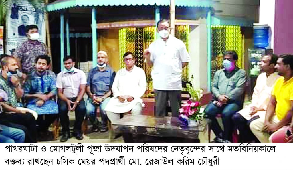 শুক্রবার ৯ অক্টোবর মেয়র প্রার্থী রেজাউল করিম চৌধুরীর বহদ্দারহাটস্থ নিজ বাসভবন প্রাঙ্গণে অনুষ্ঠিত মতবিনিময় সভায় অন্যান্যদের মাঝে বক্তব্য রাখেন মোগলটুলী শারদীয় দুর্গোৎসব উদযাপন পরিষদের সভাপতি জগন্নাথ সরকার, সাধারন সম্পাদক অভিজিৎ নাথ, সিনিয়র সহ-সভাপতি শংকর দাশগুপ্ত, যুগ্ম সাধারন সম্পাদক বিপ্লব ধর, নির্বাহী সদস্য টিটু দত্ত, অনুপম এবং ইকবাল রোডস্থ পাথরঘাটা মনোহরখালি দূর্গামন্দিরের সভাপতি ক্ষুদিরাম দাশ, সাধারন সম্পাদক সাগর দাশ, কোষাধ্যক্ষ রুহি দাশ, বিপ্লব দাশ, রাজুপদ দাশ, রবি দাশ, সত্যজিৎ দাশ, সুব্রত দাশ ও পাথরঘাটা ওয়ার্ডের কাউন্সিলর পদপ্রার্থী পুলক খাস্তগীর প্রমুখ।