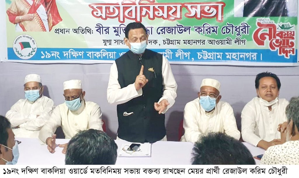 চিটাগাং মেইল: আসন্ন চট্টগ্রাম সিটি কর্পোরেশন নির্বাচন উপলক্ষে ১৯নং দক্ষিণ বাকলিয়া ওয়ার্ডের কেন্দ্র নির্বাচন পরিচালনা কমিটির আহবায়ক-সচিব ও দলীয় নেতা-কর্মীদের সাথে মতবিনিময় সভা সম্প্রতি স্থানীয় একটি কমিউনিটি সেন্টারে অনুষ্ঠিত হয়।এতে প্রধান অতিথি হিসেবে বক্তব্য রাখেন আওয়ামী লীগ মনোনীত চসিক মেয়র পদপ্রার্থী বীর মুক্তিযোদ্ধা এম. রেজাউল করিম চৌধুরী।