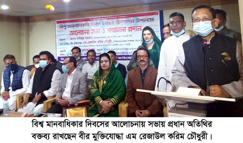 ডিজিটাল আন্তর্জাতিক মানবাধিকার ফাউন্ডেশন চট্টগ্রাম বিভাগীয় শাখার উদ্যোগে বিশ্ব মানবাধিকার দিবস উপলক্ষে ১০ ডিসেম্বর বৃহস্পতিবার বিকাল ৪টায় নগরীর মোমিন রোডস্থ সুপ্রভাত স্টুডিও হলে আলোচনা সভা, সম্মাননা প্রদান ও সাংস্কৃতিক অনুষ্ঠানে প্রধান অতিথির বক্তব্যে বীর মুক্তিযোদ্ধা আলহাজ্ব এম. রেজাউল করিম চৌধুরী এ কথা বলেন।