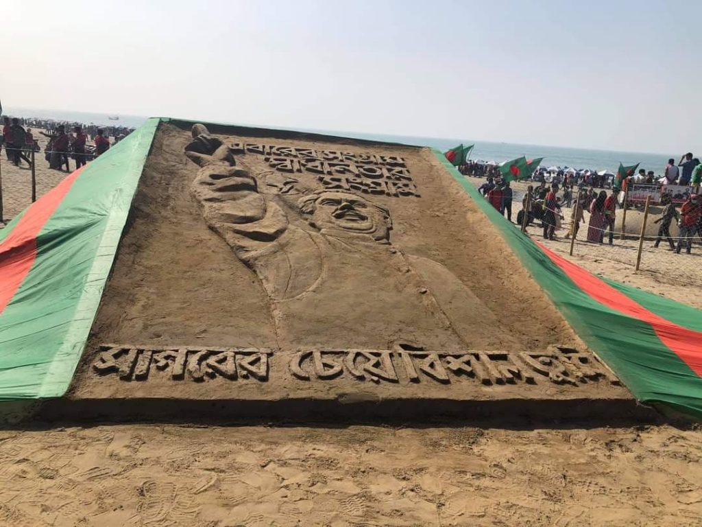 কক্সবাজার প্রতিনিধি: বঙ্গবন্ধুর জন্মশতবার্ষিকী উপলক্ষে এবং ভাস্কর্য ভাঙ্গার প্রতিবাদে কক্সবাজার সমুদ্র সৈকতে নির্মাণ করা হয়েছে বঙ্গবন্ধুর সর্ববৃহৎ বালু ভাস্কর্য।