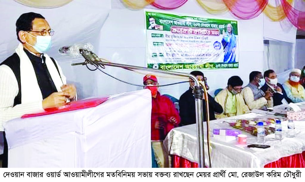 দেওয়ান বাজারস্থ আবুল কালাম সওদাগরের বাসভবন প্রাঙ্গণে অনুষ্ঠিত আওয়ামী লীগ মনোনীত চসিক মেয়র পদপ্রার্থী বীর মুক্তিযোদ্ধা এম. রেজাউল করিম চৌধুরী বলেন, আমি আওয়ামী লীগের একজন নিবেদিত প্রান কর্মী, বঙ্গবন্ধুর আদর্শের সৈনিক, জননেত্রী শেখ হাসিনার কর্মী। গণ মানুষের কল্যানই বঙ্গবন্ধু, আওয়ামী লীগ ও শেখ হাসিনার আদর্শ। কর্মী হিসেবে আমি আওয়ামী লীগ ও শেখ হাসিনা কর্তৃক মনোনীত হয়ে চট্টগ্রামের মানুষের সেবা করতে চাই। নৌকায় ভোট দিয়ে আমাকে আপনাদের সেবক হওয়ার সুযোগ দিন।